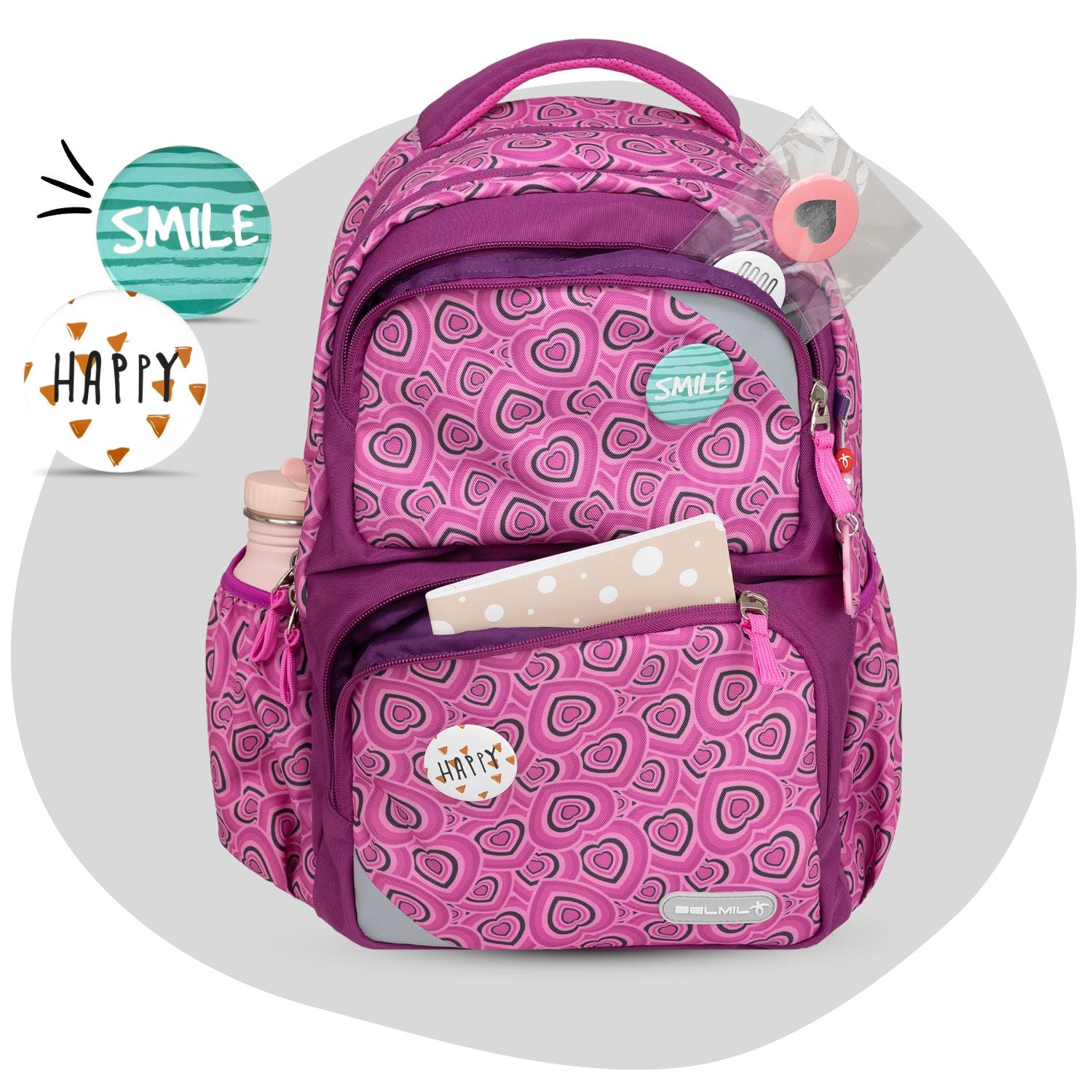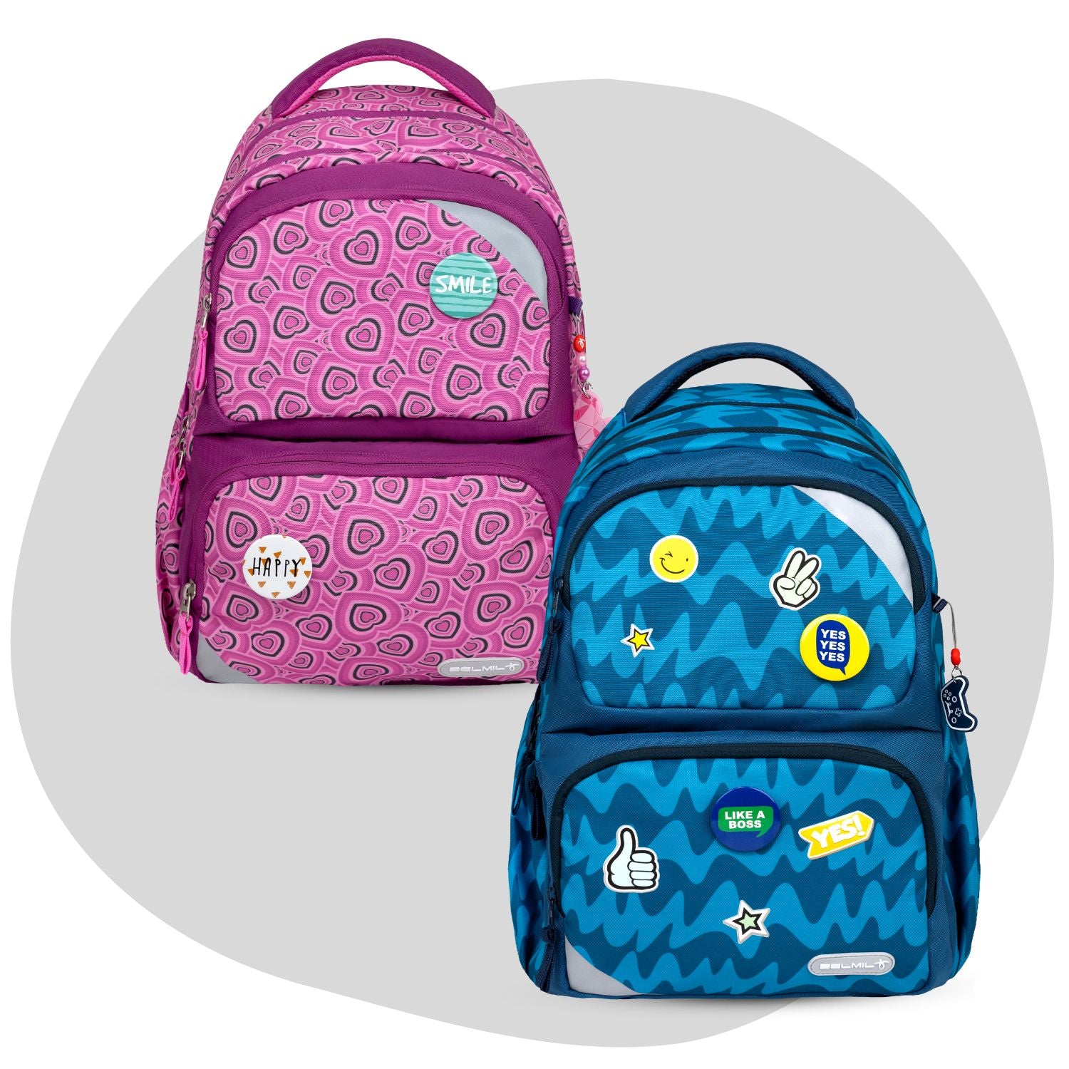 The Maxi Pack collection stands out with its colorful patterns, making it a stylish choice for students. It comes with three magnetic patches, allowing for easy customization and a personal touch. If a child chooses not to use the metal patches, they can be easily removed without leaving any visible marks where the magnets are sewn in. This seamless combination of vibrant design and customizable features makes the Maxi Pack both fun and functional for everyday use.