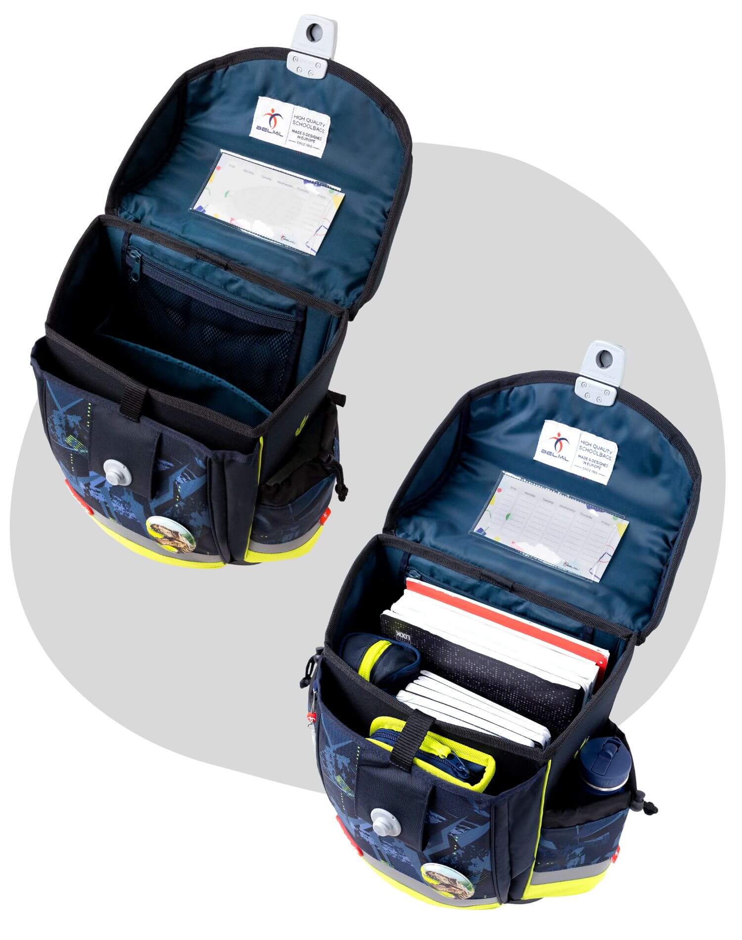 Eine effektive Gewichtsverteilung spielt eine entscheidende Rolle in der Ergonomie unserer Taschen. Das interne Aufbewahrungskonzept ermöglicht das Platzieren schwerer Schulbücher im hinteren Bereich, gesichert durch Bänder/Fächer. Die Einbeziehung eines Brustgurts und Hüftgurts gewährleistet, dass der Rucksack nah am Körper bleibt und die Wirbelsäule von unnötigem Stress und Belastung befreit wird.