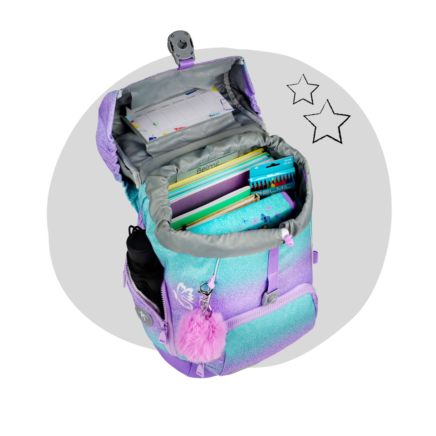 Our Comfy Plus bags contains: Inner dividers for easy organisation, front pocket for pencil case, side pocket with mesh as a bottle holder (0.7 L), a zipper pocket on top for storing raincover or keys, drawstring for fixing the content.