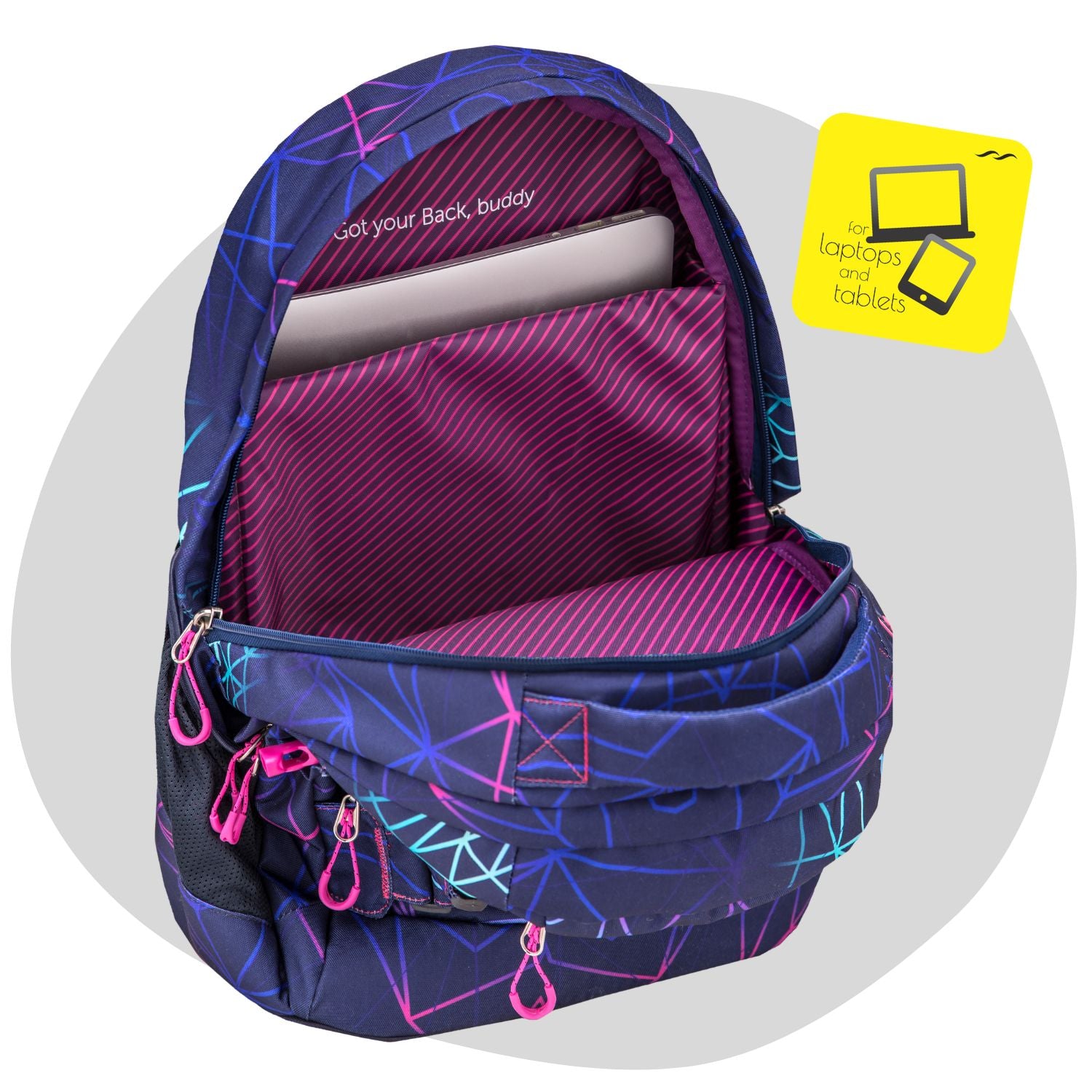 - Zwei Innenfächer, davon ein kleineres mit Reißverschluss und Netz, gepolsterte Halterungen für Laptop (15,6") und Tablet (10"), zwei Fronttaschen, zwei elastische Seitentaschen mit Netz für eine Wasserflasche (0,7 L) oder einen Regenschirm, 2 Riemen auf der Vorderseite für ein Skateboard oder eine Jacke, versteckte Tasche auf der Rückseite